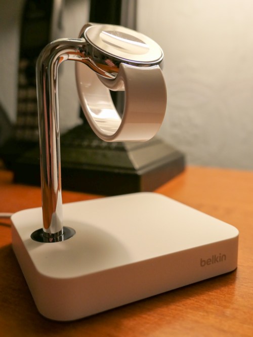 The Belkin is a simple, silver and white stand with a built-in Apple Watch magnetic charging module.