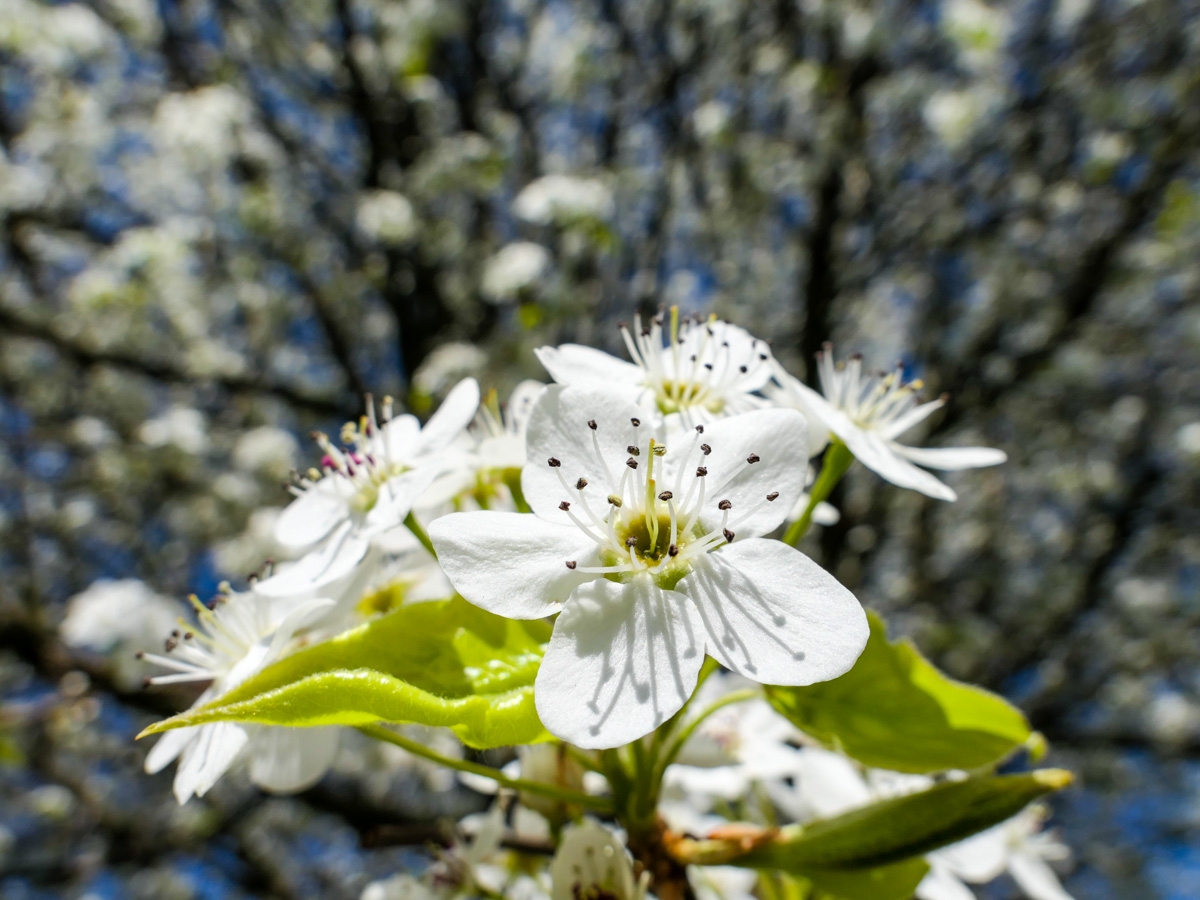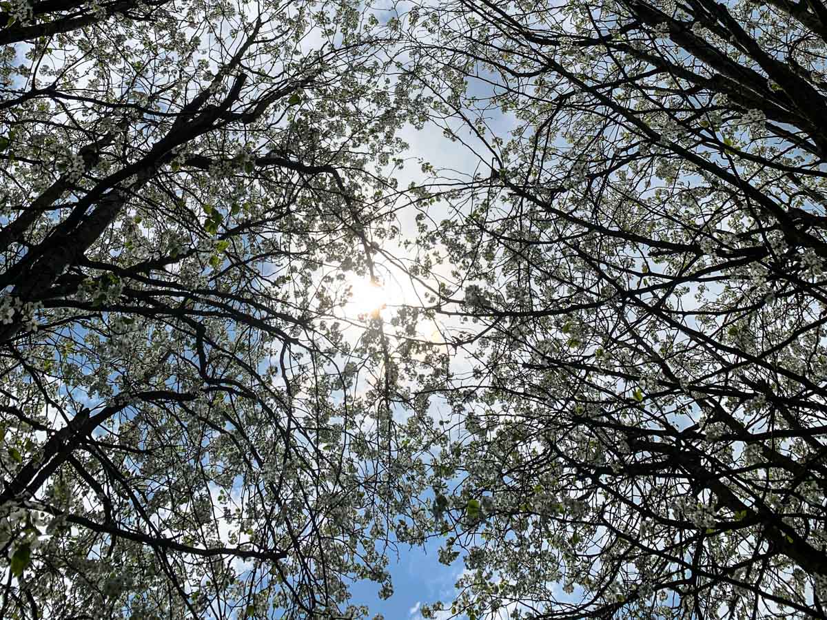 They’ve never born fruit, but they’ve always put on a big show in spring. During the third week of April, hundreds of beautiful little white flowers bloom on the trees.