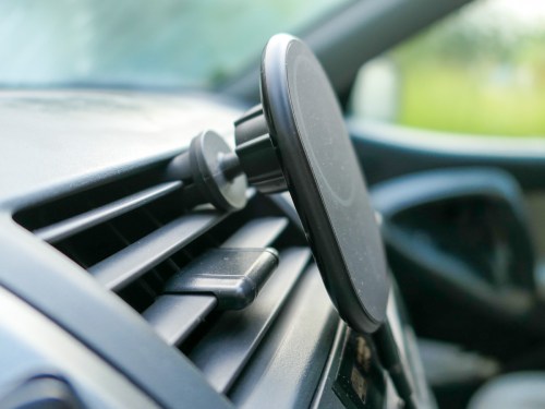 I picked up Belkin’s Magnetic Wireless Car Charger that’s MagSafe-compatible and mounted it to one of the air vents on my dash.
