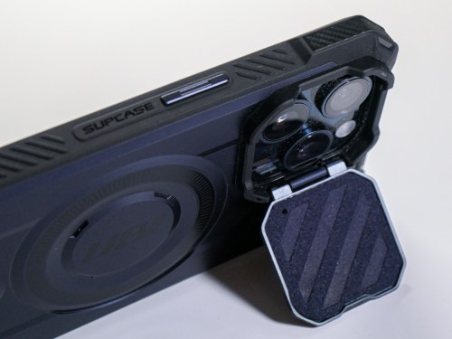 The case fits really nicely, and its distinguishing feature is its little folding door cover for my iPhone’s three camera lenses.