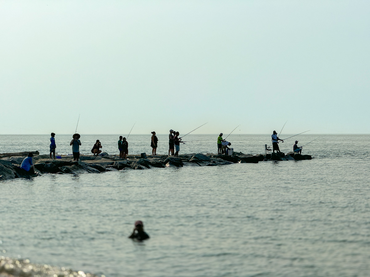 I didn’t like the person swimming in the foreground of this shot, because I want the viewer to focus on all the people fishing on the jetty. So, I simply adjusted the focus towards the background.