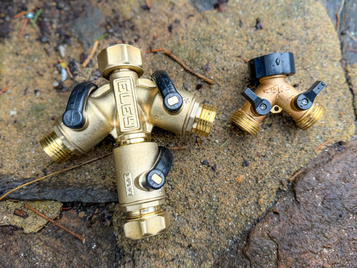 The brass garden hose splitter looked more like a replacement part for a tank. Here’s how it compares next to a traditional water spigot splitter you can pick up anywhere.
