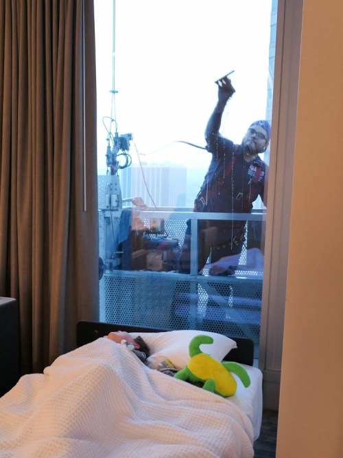 We woke up one morning to a window washer outside our 43rd story hotel window at 6AM. My son’s response: Curiosity and delight