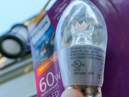 I’m detecting a certain industry ‘hedge’ when it comes to screwing in light bulbs outdoors. No, my Philips LED doesn’t have a “use at your own risk outside” warning label. In fact, on the base of the bulb, the fine print said, “suitable for damp locations.”
